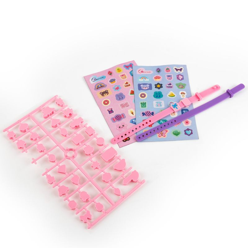 Zestaw dla małych projektantek biżuterii zawierający dwie bransoletki w odcieniach fioletu i różu oraz 32 charmsy, które można swobodnie nakładać i zdejmować. Każdy charms można dodatkowo spersonalizować dzięki dołączonym 64 naklejkom. Idealny prezent pozwalający na wyrażenie indywidualnego stylu, a stworzoną bransoletką można wymienić się z przyjaciółką.