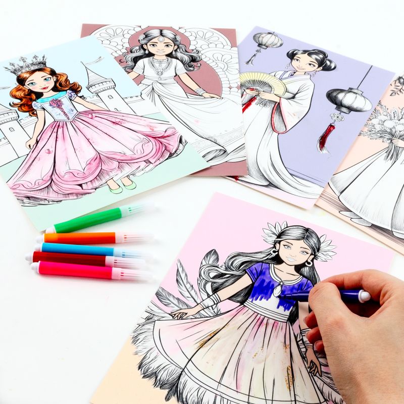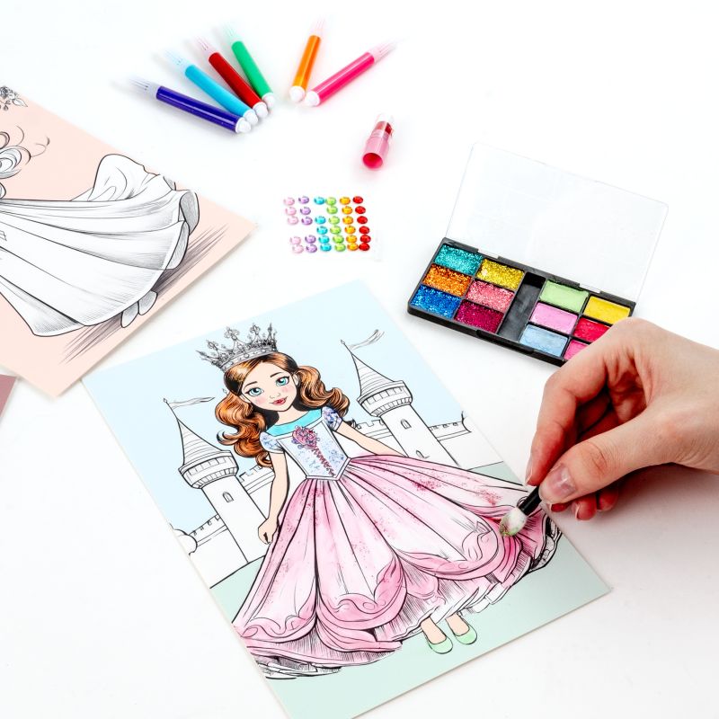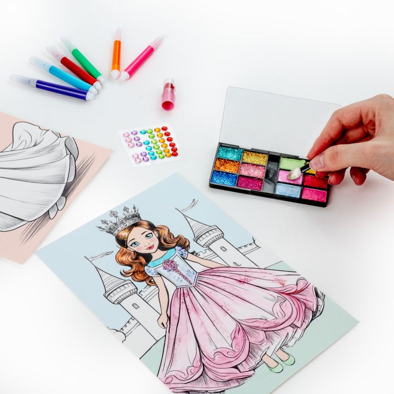 Plansze do kolorowania beauty. Dla małych artystek, które pragną wcielić się w rolę prawdziwej projektantki mody. Zestaw obejmuje 5 plansz z motywami księżniczek w oryginalnych strojach i sukniach, 1 szminkę, 6 mini markerów, 36 diamentów oraz 12 cieni. Dzięki bogatemu wyposażeniu można stworzyć unikatowe stylizacje dla każdej z postaci – od romantycznych, kwiecistych kreacji po eleganckie, wieczorowe stroje.