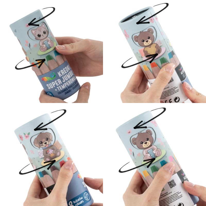 Kredki super jumbo z temperówką. W sam raz dla małych artystów uczących się pisać i kolorować. Ich wielkość i średnica 1,5cm zapewnia wygodny i stabilny chwyt dla dziecka. Kredki nie są ostro zakończone, co czyni je szczególnie bezpiecznymi nawet dla najmłodszych. Zamknięte są w uroczej tubie, którą można przekręcać i zmieniać dopasowując główki do tułowi istniejących na opakowaniu. W środku znajduje się 8 kolorów kredek idealnych wielkością pod małą rączkę oraz temperówka. To doskonały wybór dla dzieci rozpoczynających przygodę z rysowaniem, który wspiera rozwój motoryki małej i zachęca do twórczej ekspresji.