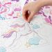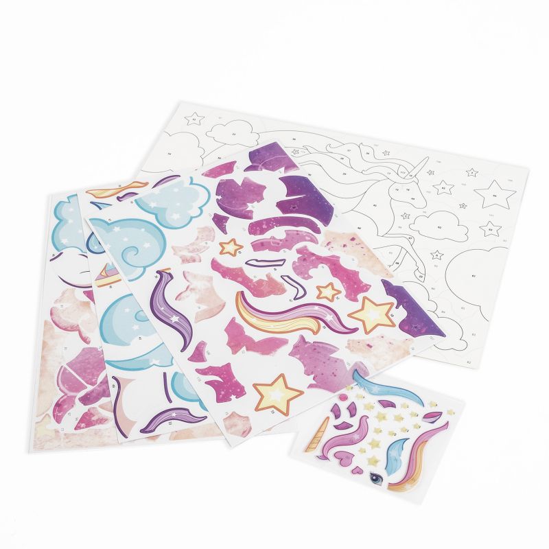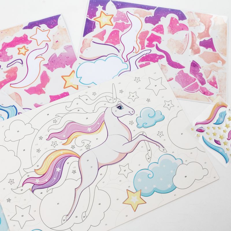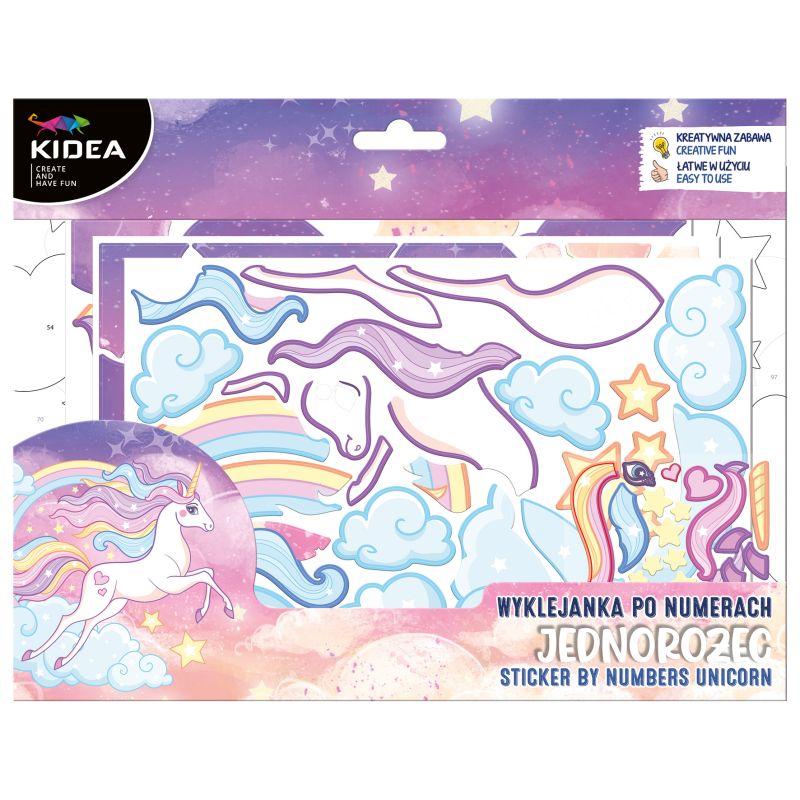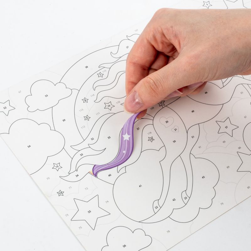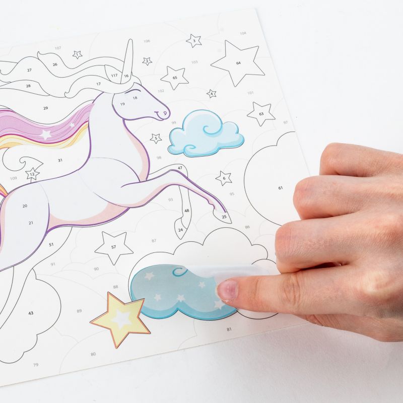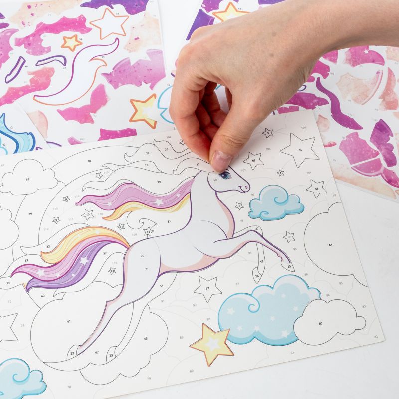 Stwórz piękne obrazy bez farb i pędzli. Wyklejanie po numerach. Obraz ma ponumerowane pola, które uzupełnia się odpowiednimi naklejkami z załączonych arkuszy. Każdy numer wskazuje, którą naklejkę gdzie należy przykleić, dzięki czemu zabawa jest prosta i intuicyjna. Wyklejanka rozwija koncentrację i dokładność, a jednocześnie gwarantuje czyste ręce i brak bałaganu. Motywem przewodnim jest bajkowy jednorożec w magicznej scenerii. Powstały obraz można dokleić do tekturki i będzie gotowy do powieszenia lub podarowania jako prezent.