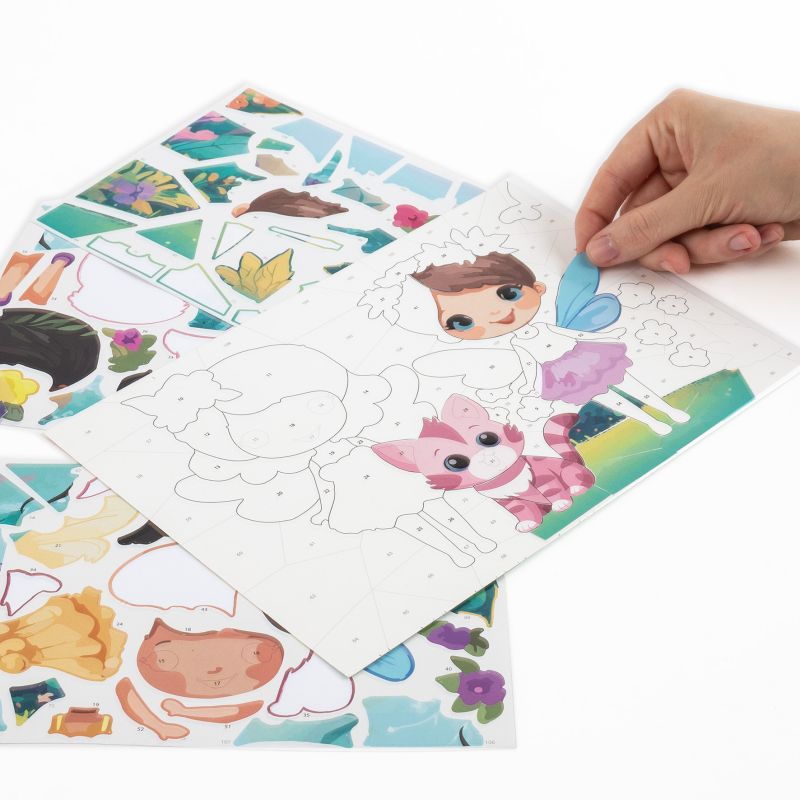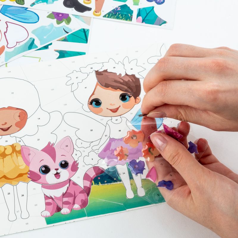 Stwórz piękne obrazy bez farb i pędzli. Wyklejanie po numerach. Obraz ma ponumerowane pola, które uzupełnia się odpowiednimi naklejkami z załączonych arkuszy. Każdy numer wskazuje, którą naklejkę gdzie należy przykleić, dzięki czemu zabawa jest prosta i intuicyjna. Wyklejanka rozwija koncentrację i dokładność, a jednocześnie gwarantuje czyste ręce i brak bałaganu. Motywem przewodnim są urocze wróżki w magicznym świecie. Powstały obraz można dokleić do tekturki i będzie gotowy do powieszenia lub podarowania jako prezent.